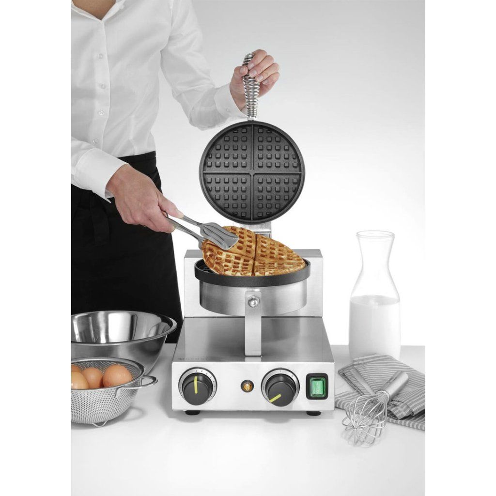 Tento okrúhly vaflovač je určený pre profesionálne gastro prevádzky aj prevádzky s rýchlou obsluhou, kde je dôležitá konzistentná kvalita a presná kontrola prípravy. Liaty hliník s odolným nepriľnavým povrchom Teflon® zabezpečuje rovnomerné prepečenie a jednoduchú manipuláciu pri každej várke.