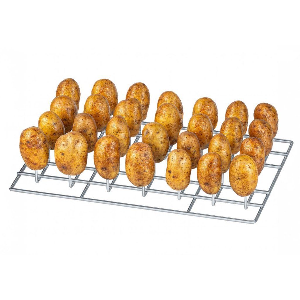 Nerezový rošt GN 1/1 určený na pečenie zemiakov alebo kukurice ponúka rýchlejšiu prípravu ako v prípade štandardných postupov tepelnej úpravy. Pri zemiakoch sa môže čas pečenia skrátiť do 35 %, pri kukurici dokonca až do 50 %.