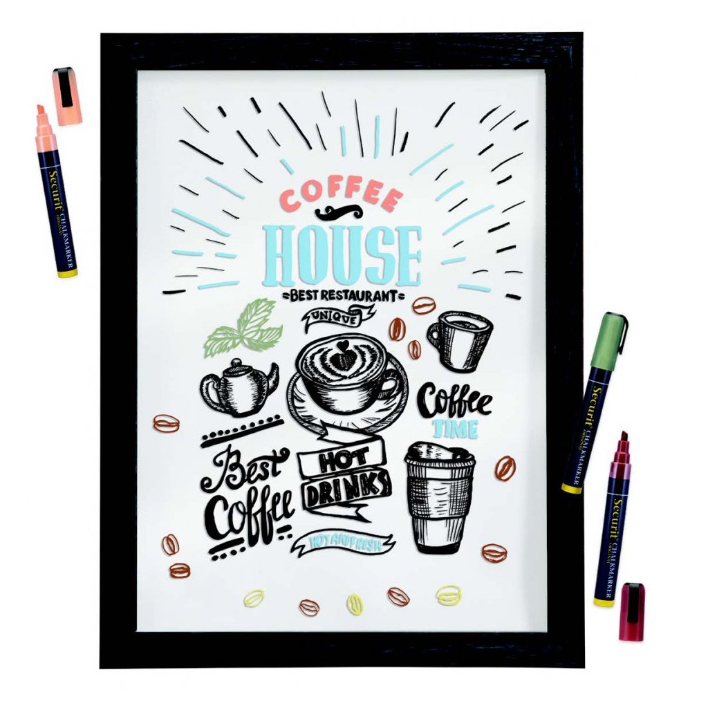 Obsahuje písmená, čísla, znaky, piktogramy a symboli z oblasti pohostinstva.
