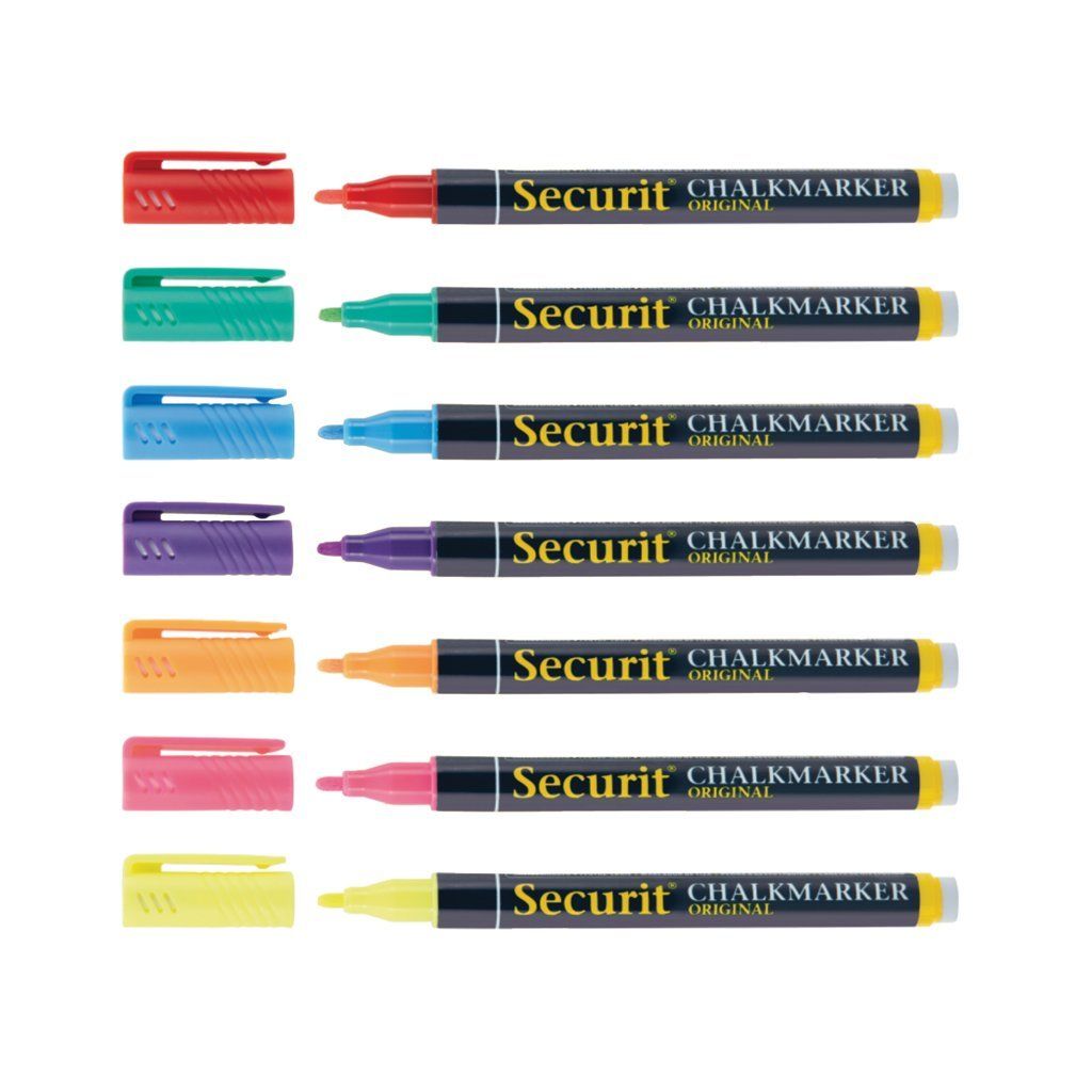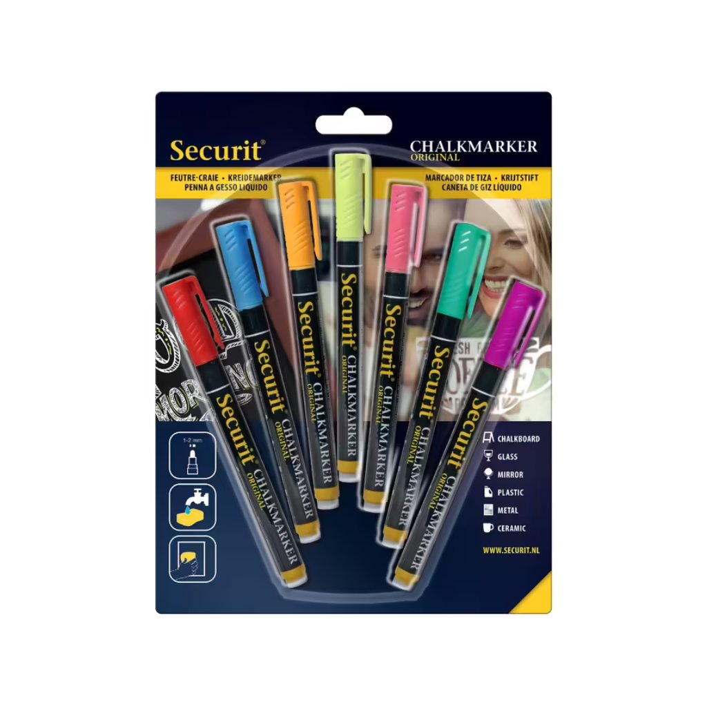 Táto sada siedmich kriedových popisovačov s tenkým hrotom 1–2 mm je ideálna na detailné značenie, jemné písmo a farebné zvýraznenie oznamov v interiéri aj exteriéri. Obsahuje rôzne farby, ktoré umožňujú efektívne odlíšiť kategórie, produkty alebo zobraziť zaujímavé grafické prvky. Perfektne sa hodia na hladké povrchy ako sklo, vitríny, tabuľky či plastové štítky. Po použití ich jednoducho zotriete vlhkou handričkou.
