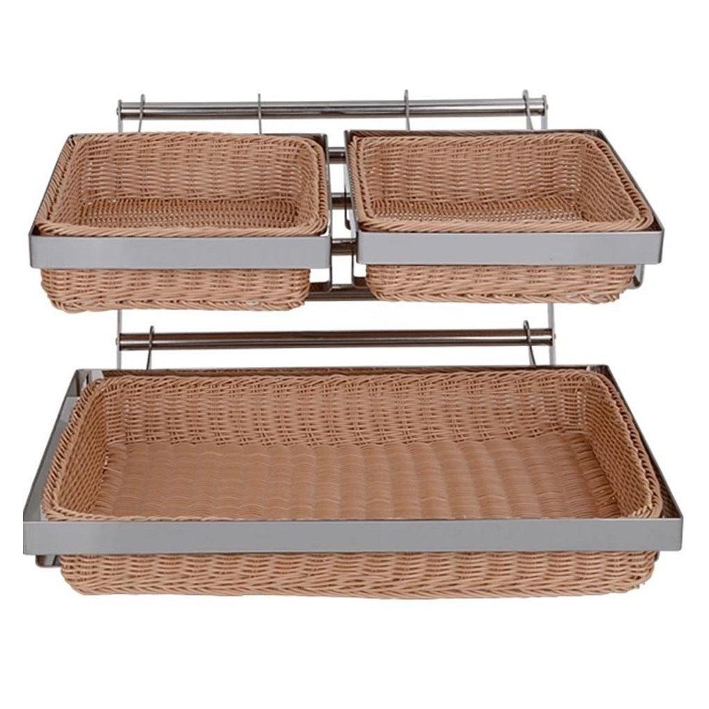 V prostredí bufetu či cateringovej akcie sa tento stojan predstavuje ako štýlový a funkčný prvok – robustná konštrukcia z nehrdzavejúcej ocele v tmavom prevedení a tri košíky z odolného polyratanu vytvárajú príjemný prírodný dojem a praktické usporiadanie.