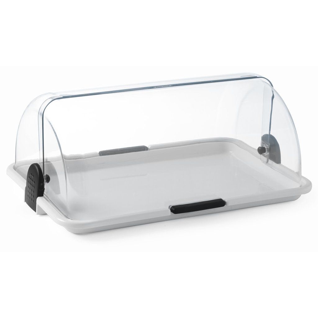 Jednoposchodová roll top vitrína je ideálnym riešením pre štýlovú prezentáciu pečiva, ovocia, syrov či iných pochutín na raňajkových bufetoch, cateringových stoloch alebo vo vitrínach hotelov. Vďaka zakrivenému výklopnému krytu umožňuje jednoduchý prístup k jedlám, pričom zároveň zabezpečuje ich ochranu pred prachom, hmyzom či baktériami. Moderný vzhľad dopĺňa kvalitné plastové prevedenie, ktoré je zároveň odolné a ľahko udržiavateľné.
