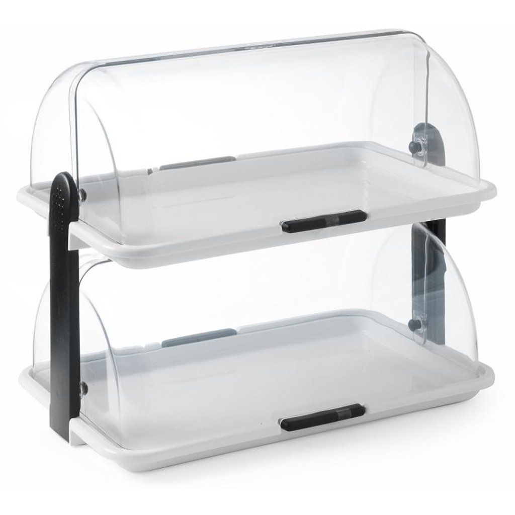 Dvojposchodová roll top vitrína predstavuje praktické a elegantné riešenie pre efektívne servírovanie viacerých druhov jedál na malom priestore. Vďaka dvom úrovniam ponúka výborný prehľad aj kapacitu, čo oceníte pri podávaní pečiva, ovocia, sladkostí či tapas. Výklopný roll top kryt znižuje riziko kontaminácie a zároveň uľahčuje obsluhu. Vitrína je vyrobená z pevného, hygienicky nezávadného plastu, ktorý sa ľahko čistí a odoláva záťaži pri častom používaní.
